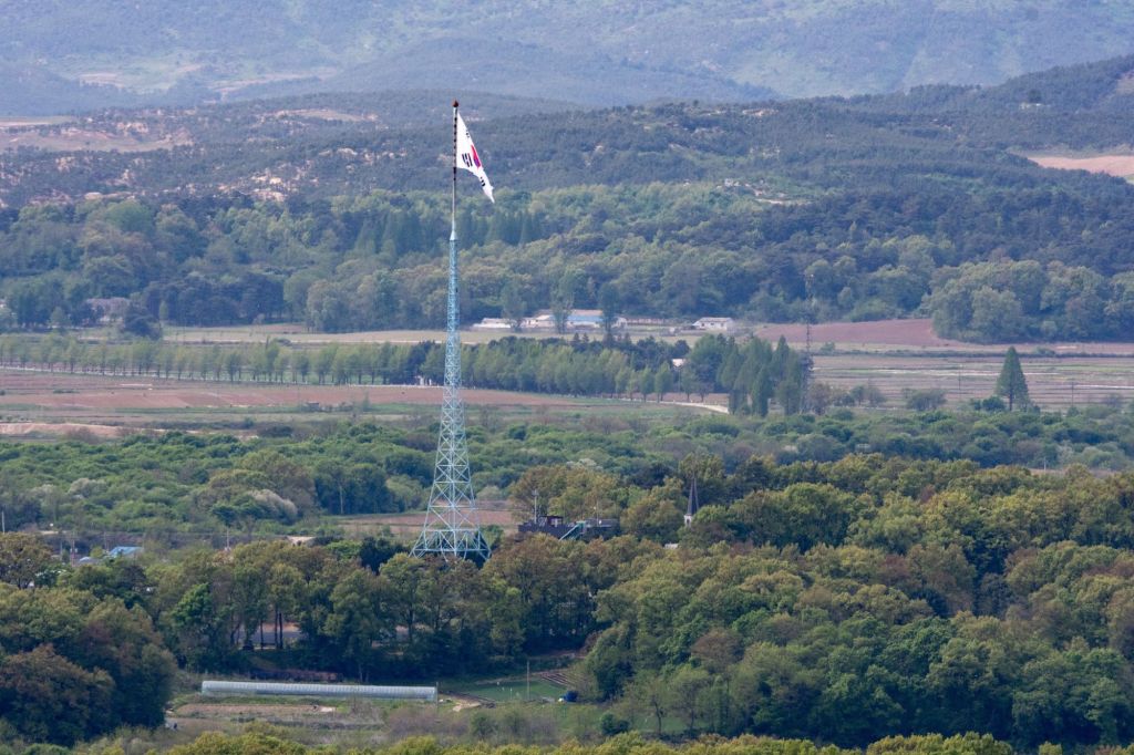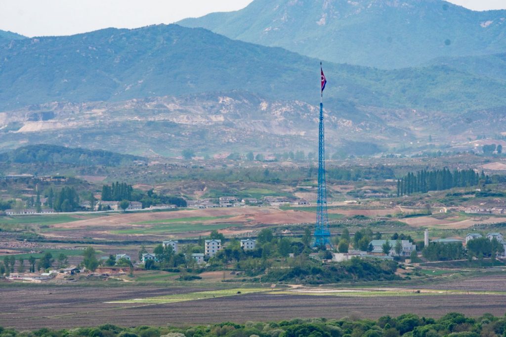 In the 1980s, the South Korean government built a 100 m flagpole in Daeseong-dong, which flies a South Korean flag weighing 130 kilograms . In what some have called the “flagpole war”, the North Korean government responded by building the 160 m Panmunjeom flagpole in Kijŏng-dong, only 1.2 km west of the border with South Korea. It flies a 270 kg flag of North Korea. Daeseong-dong is a village in South Korea close to the North Korean border. Daeseong-dong is only 1.6 km from Kijong-dong, a village in North Korea’s portion of the DMZ. Here Korea’s division is starkly apparent: rival national flags can be seen on gigantic flagpoles that have been erected in the two villages.