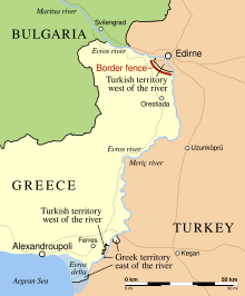 Turkey – Greek border is 206 km long, this boundary was confirmed by the Treaty of Lausanne (1923), which resolved persistent boundary and territorial claims involving areas in Thrace and provided for a population exchange. Under the agreement, most members of the sizable Greek-speaking community of western Turkey were forced to resettle in Greece, while the majority of the Turkish-speaking residents of Thrace who were not forced out during the Balkan wars were removed to Turkey. It mostly follows the river Evros. It is the external border of the European Union.