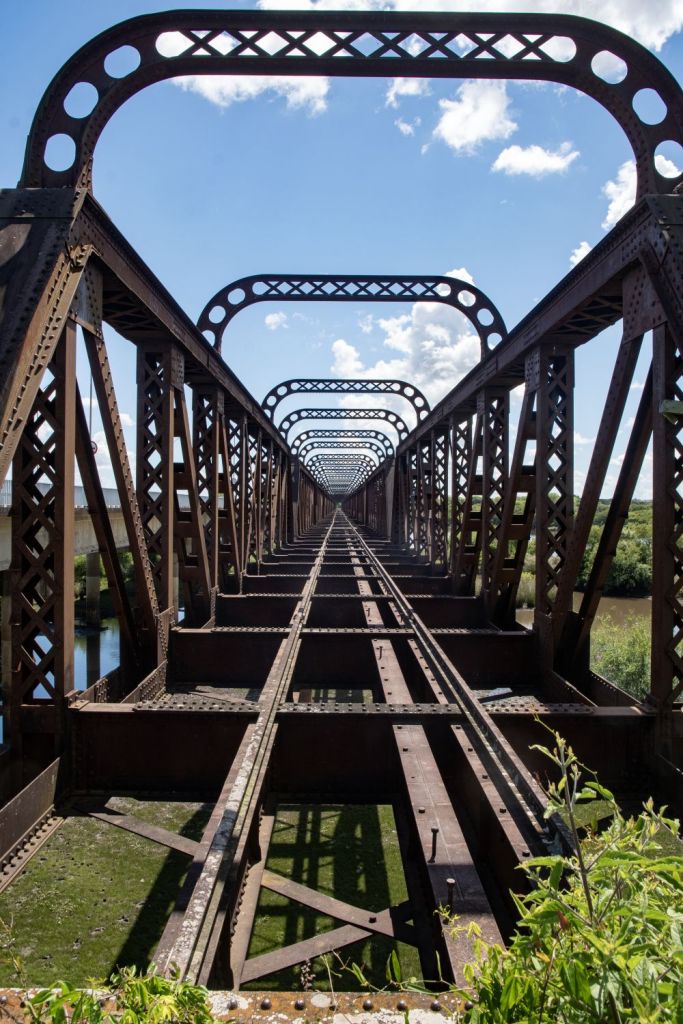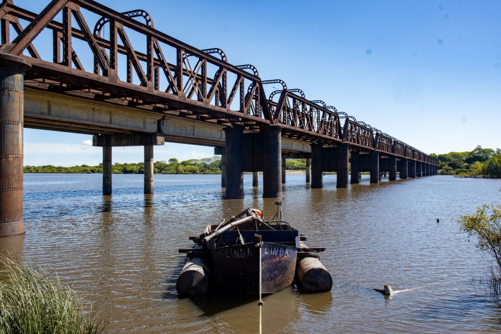 Next to the modern road bridge is a historic railway bridge from 1915, showing how transportation has evolved at this border crossing. The rail bridge was opened in 1887 by the English company The Brazil Great Southern Railway Co. Ltd., who operated it until 1924, when the State of Rio Grande do Sul took it over. The bridge was designed to facilitate the transportation of salted beef products. The last train crossed in 1988 and it is now in an advanced state of disrepair. The tracks on either side have been removed. The community of Barras has requested consideration of a project that would give a tourist and leisure purpose to one of the most significant and beautiful bridges in the state of Rio Grande do Sul.