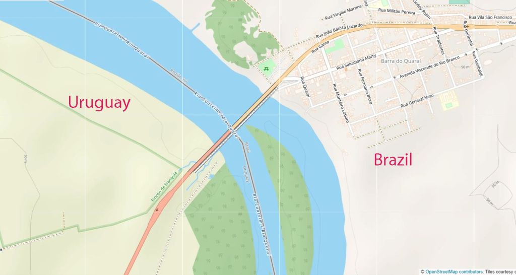 Tripoint areas are fascinating. Our primary focus was to visit the southernmost tripoint in the world – ARBRUY – the tripoint between Argentina, Brazil and Uruguay, however as is the case with wet tripoints there are also physical links and/or ferries between the adjacent countries. The Bella Unión – Barra do Quaraí International Bridge is a concrete bridge that spans 670 meters across the Quaraí River, connecting Bella Unión in Uruguay with Barra do Quaraí in Brazil. Uraguay is linked to Argentina via a ferry between Bella Unión and Monte Caseros, Argentina details here.