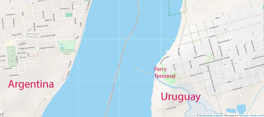 Tripoint areas are fascinating. Our primary focus was to visit the southernmost tripoint in the world – ARBRUY – the tripoint between Argentina, Brazil and Uruguay, however as is the case with wet tripoints there are also physical links and/or ferries between the adjacent countries. Uruguay is linked to Argentina via a ferry between Bella Unión and Monte Caseros whereas Uruguay is linked with Brazil via the Bella Unión – Barra do Quaraí International Bridge, details here