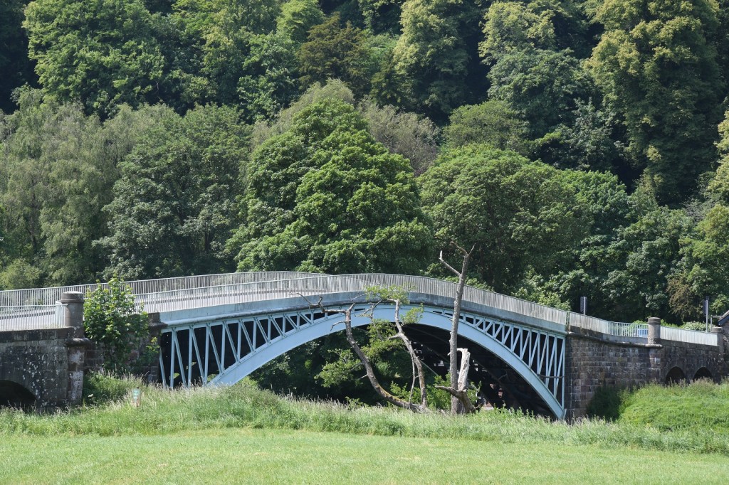 The elegant cast-iron road bridge was built in 1827 as part of the new turnpike road constructed up the lower part of the Wye valley between Chepstow and Monmouth. The bridge connects the English and Welsh sides of the river, with an abandoned but recently restored toll house on the Welsh side. The bridge comprises a single arch of 50 metres (55 yd) , and was designed by Charles Hollis of London and cast at Merthyr Tydfil.