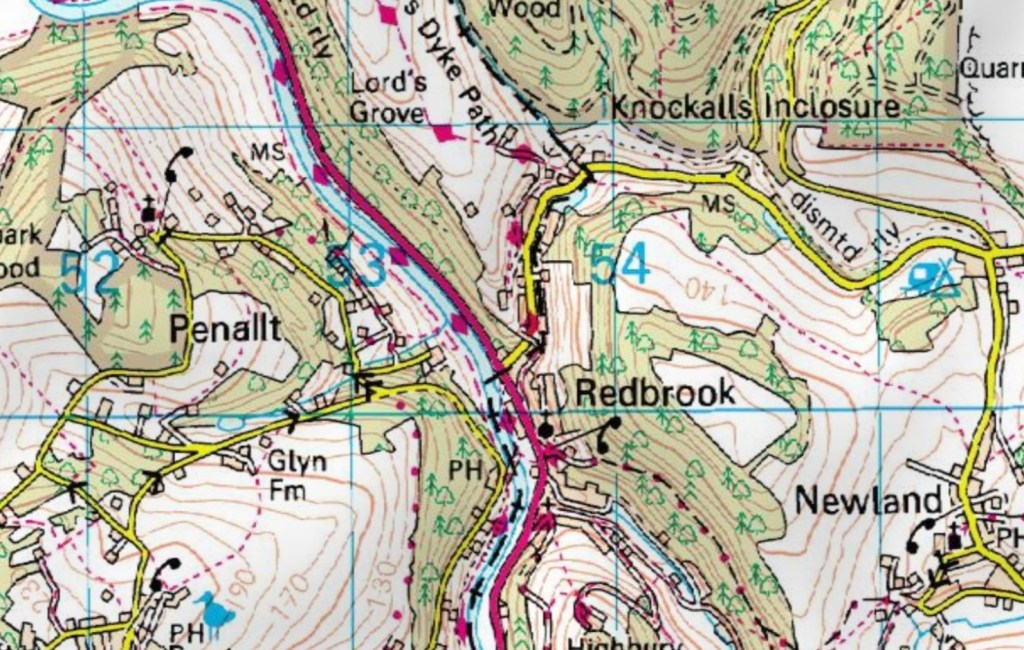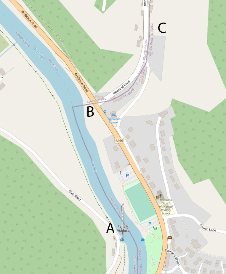 Driving north along the A466 there is no reason to get excited, it is no different from any other A road, however it does cross between England and Wales. Open Street map and the OS maps (see below) differ on exactly where the border is. The former has the border moving diagonally across the A466 into Newland Road whereas the OS map has the border moving along the south side of Newland Road.