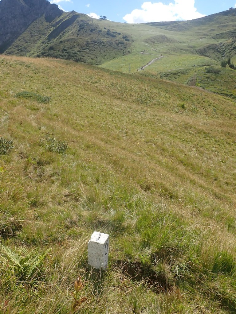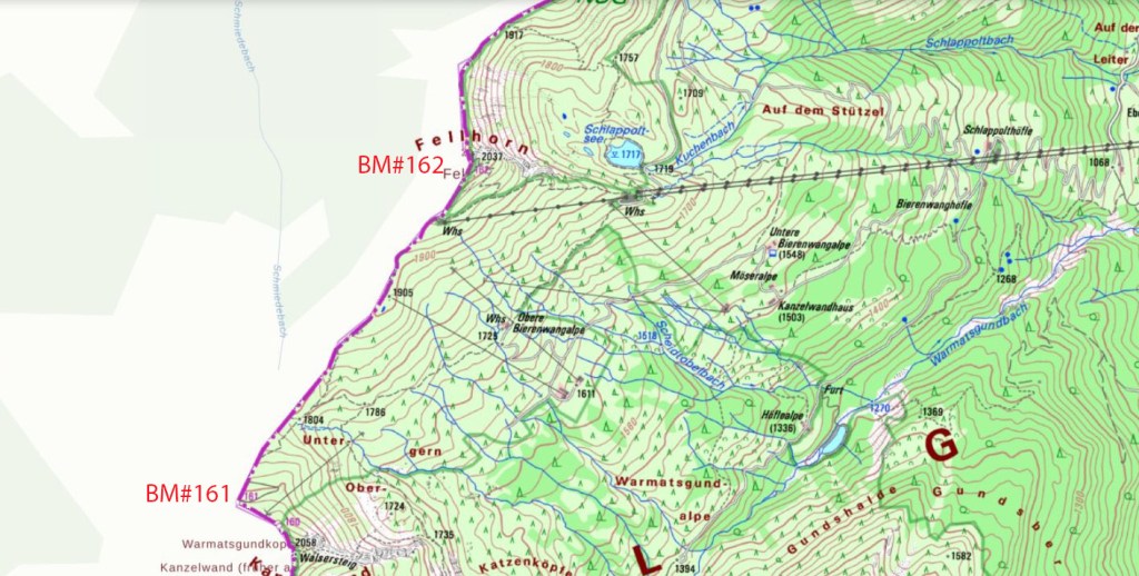 Our next focus was the mountain ridge leading to the Fellhorn (2039m), the border approximately follows the ridge and we explored a series of border markers between BM #161 and BM #162. Luckily we did not need to trek to the ridge and were able to use the Kanzelwandbahn which led us quickly in a comfortable gondola to the top (with a very nice restaurant).
