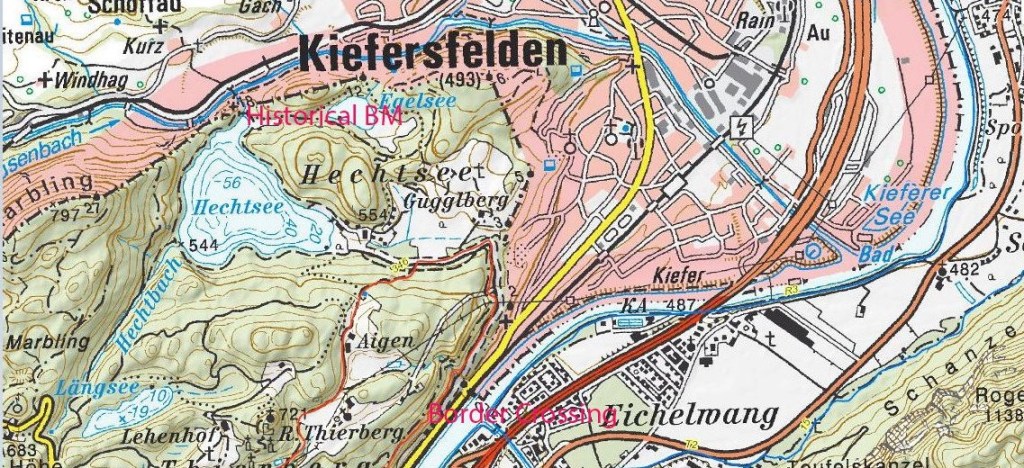 We visited this border crossing as part of the IBRG AT20 trip. Hechtsee is a lake in Tyrol, Austria. It is also the name of a scattered village. Both are part of the Kufstein District. The Austria–Germany border is located 20 meters north of the lake. There were 2 border points of interest in this area. The first is at the lake itself where there is an old border marker inscribed in a rock. The second is a short distance away where the Austria and German border meets the Inn river. At this point there is both a rail and road crossing with lots of signs demarking the border.