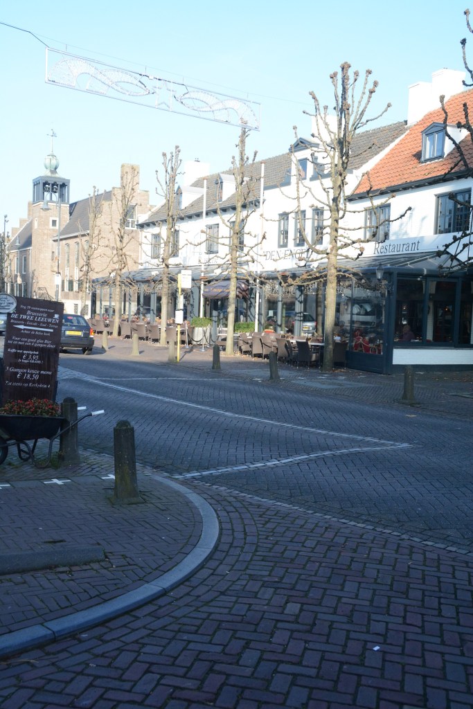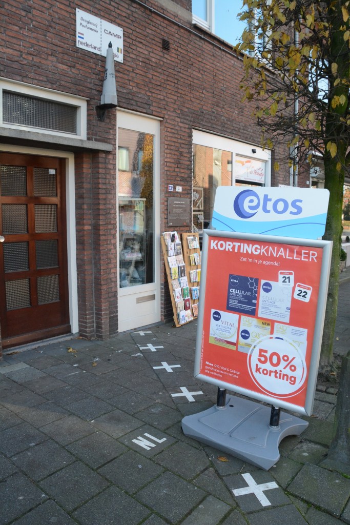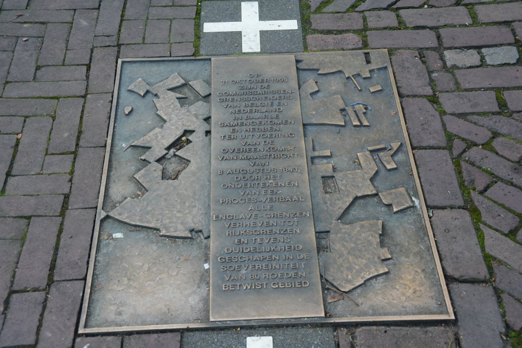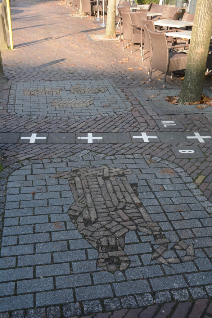 On Singel Street the border changes direction several times. There is a a symbolic border marker 214-215 which commemorates the Treaty of Maastricht in 1843 which initially demarcated the various parcels of land, a process that was not finally complete until 1995. The pavement also has the town symbols marked on it and the restaurant forms part of the border.