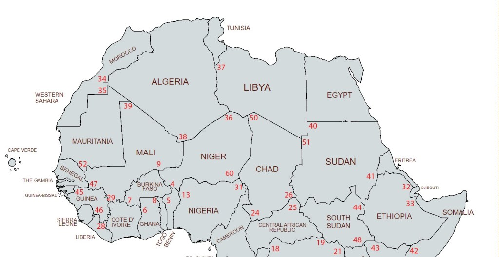 | 47 | GNMLSN | Guinea – Mali – Senegal | Established 1960 based on colonial administrative divisions from 1915. Map 1 | |||