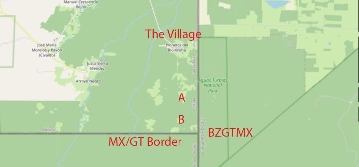 The first thing to stress is the remoteness of this tripoint. There were no prior trip reports apart from some newspaper articles which I include in the Reference section. The Belize group approached the tripoint in vehicles from their side of the border. That option was not available to us so we choose the small village of Pioneros del Río Xnohá as our start point. Getting there (and back) was a challenge in itself with over a 2 hour drive from our hotel in Xpujil. The final 12 km was on an increasingly narrow and rough road. I visited this tripoint as part of the IBRG CATEX-24 expedition. On reflection this tripoint was even harder that BGGRMK on Mount Tumba
