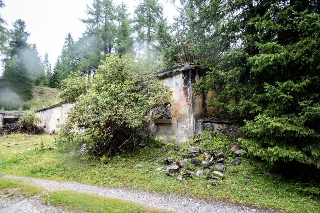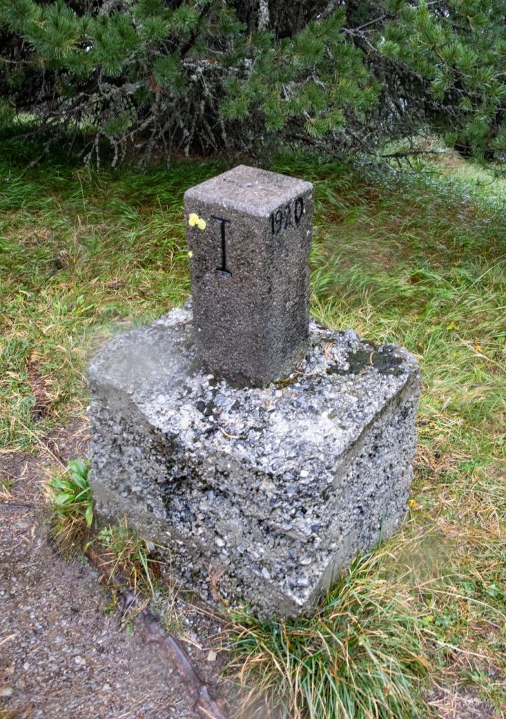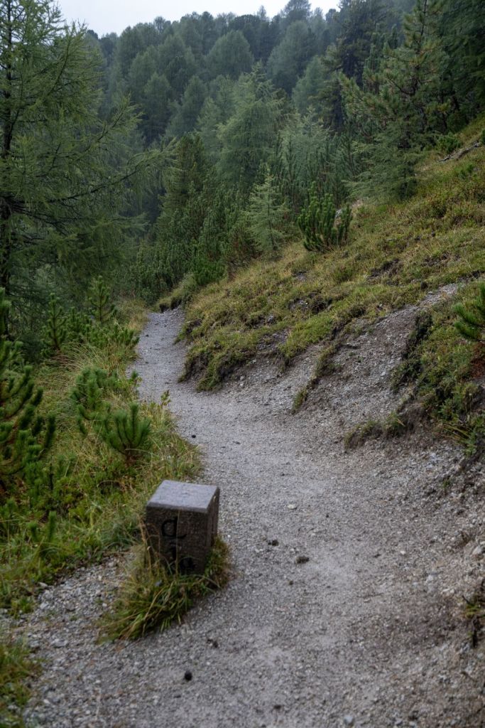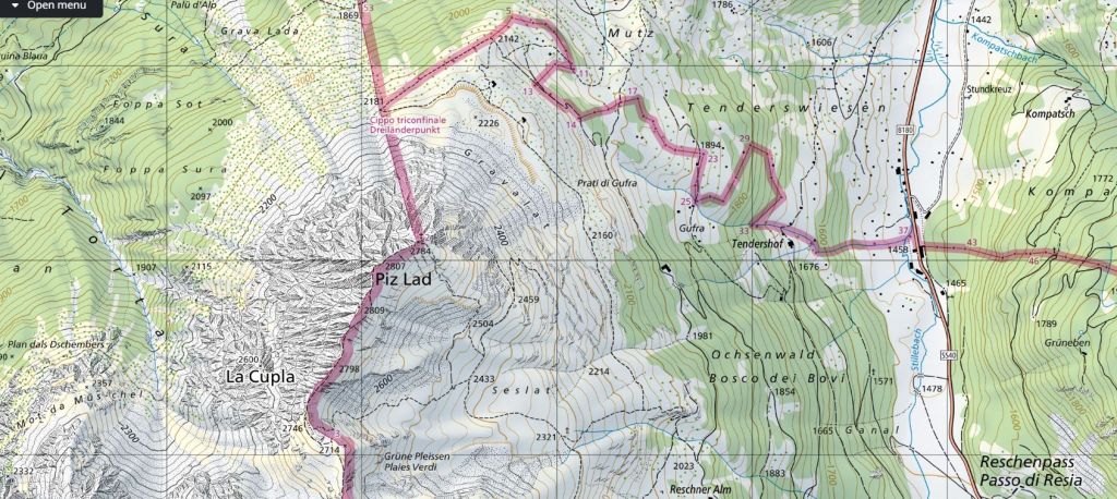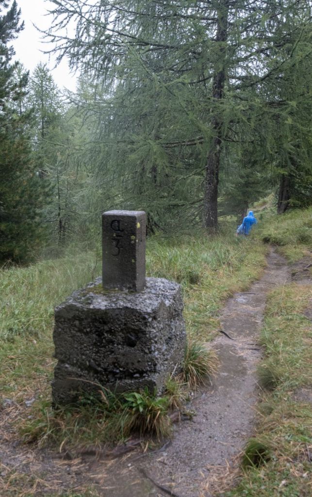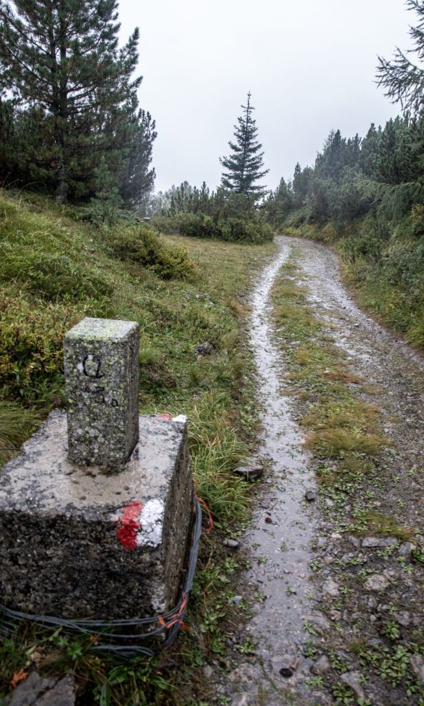 yesterday remained out of view. We choose to hike from the Rescher Alm, a mountain hut known for its regional cooking, that was sadly closed when we were there. The hike from Rescher Alm to the tripoint (Italy, Austria, Switzerland) is a moderate, roughly 3 hour, 10 km round-trip hike with about 300-700m elevation gain. Starting at 2,000m at the alp, the route winds through pine forests to the landmark, featuring historic World War II bunkers. The map below indicates the route we took, the trail passes through mountain pines, offering a mix of forest roads and alpine paths.