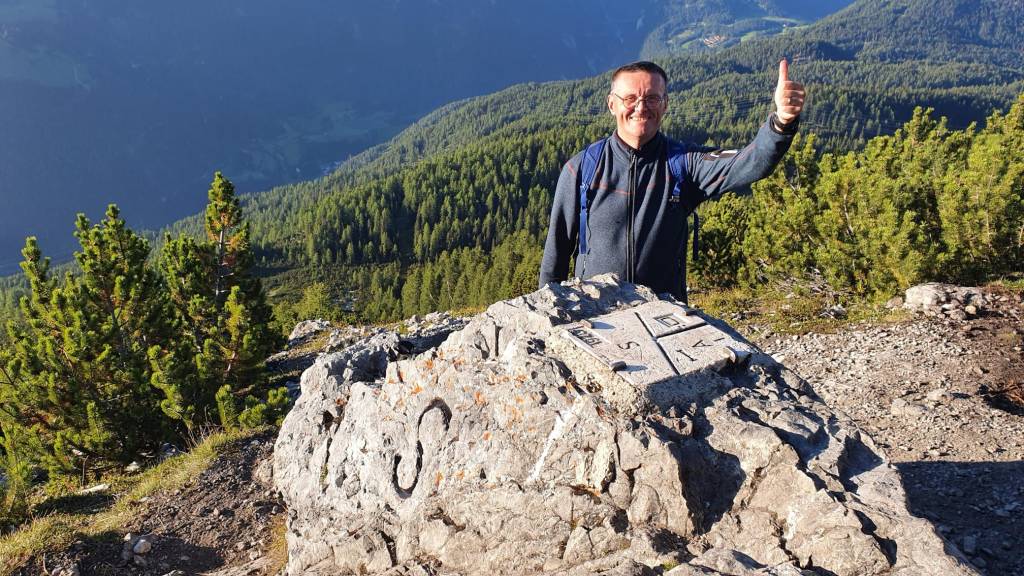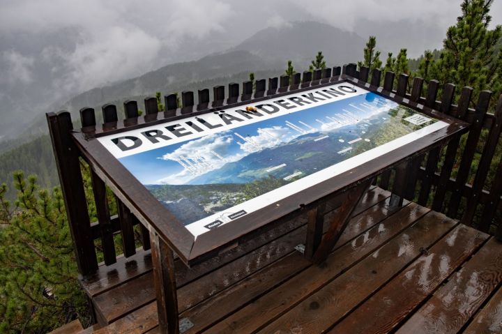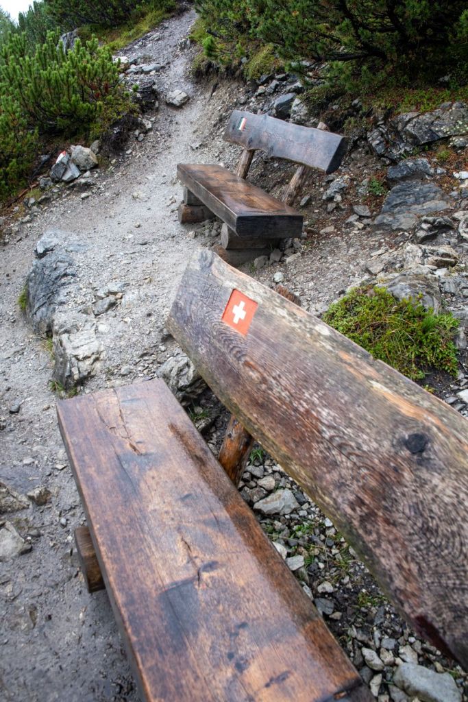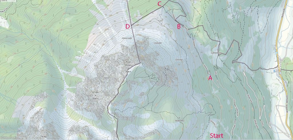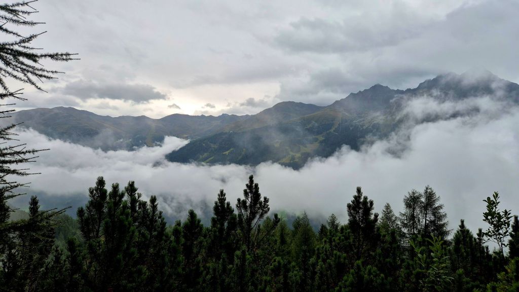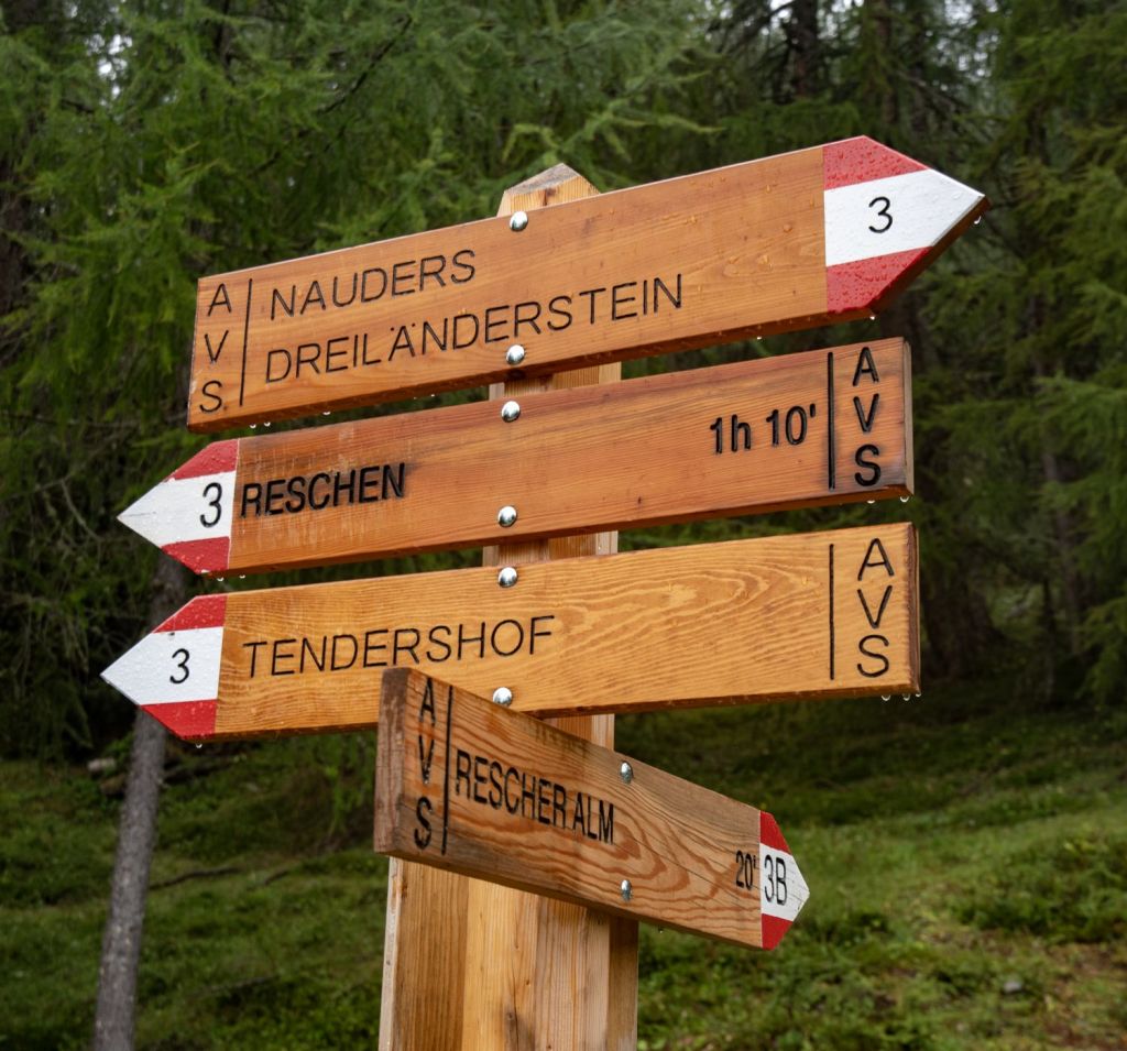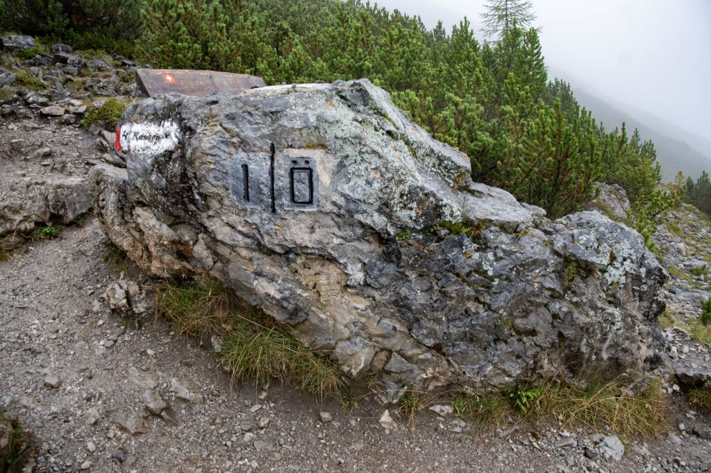 yesterday remained out of view. We choose to hike from the Rescher Alm, a mountain hut known for its regional cooking, that was sadly closed when we were there. The hike from Rescher Alm to the tripoint (Italy, Austria, Switzerland) is a moderate, roughly 3 hour, 10 km round-trip hike with about 300-700m elevation gain. Starting at 2,000m at the alp, the route winds through pine forests to the landmark, featuring historic World War II bunkers. The map below indicates the route we took, the trail passes through mountain pines, offering a mix of forest roads and alpine paths.