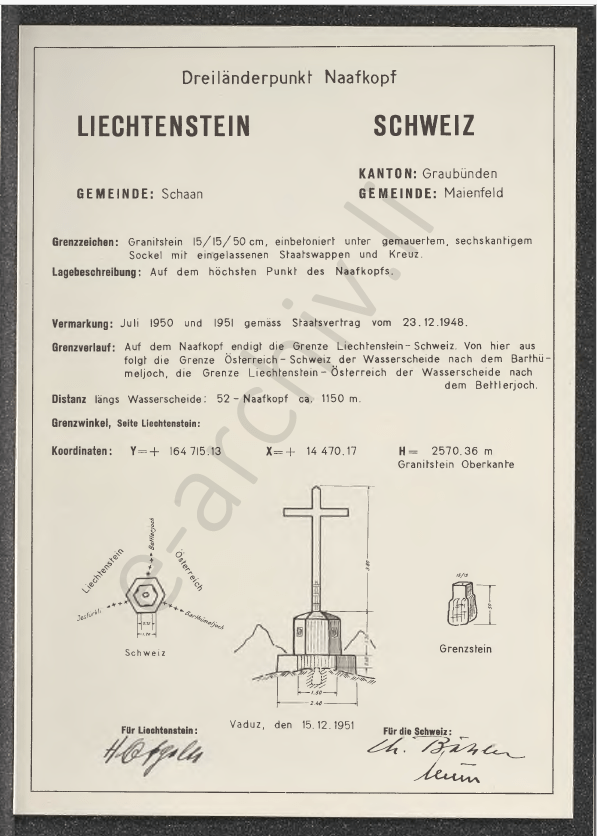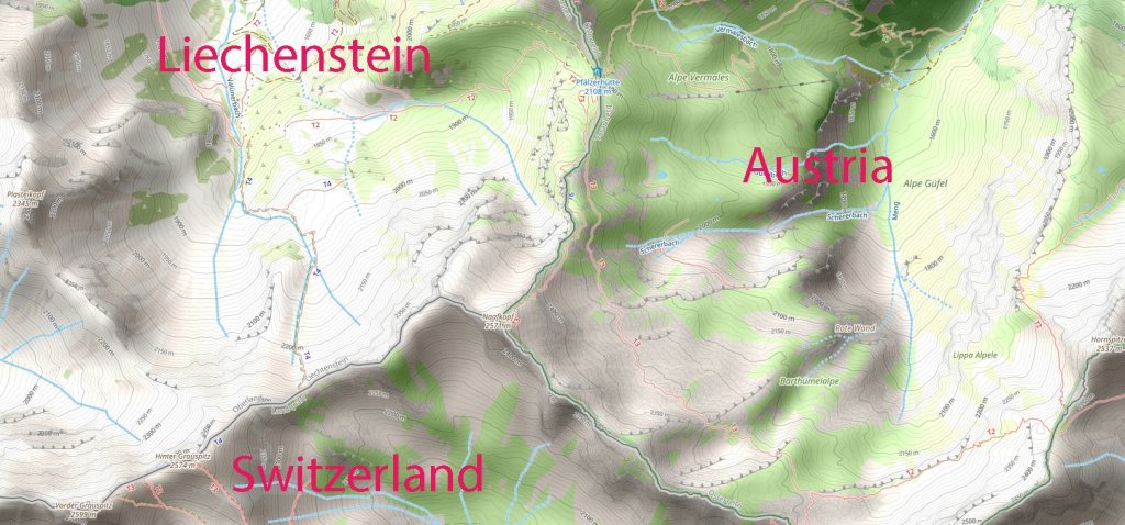 A long established tripoint dating back to 1434. The tripoint is located on the summit of the Naafkopf, a mountain in the Rätikon Alps. The tripoint is marked by a large wooden cross on a brick base that extends in three directions. Naafkopf is the third highest peak in Liechtenstein. Most people approach on the northeastern ridge which marks the Austrian-Liechtenstein border via the Pfälzerhütte, one of the two refuges operated by the Liechtenstein Alpine club.