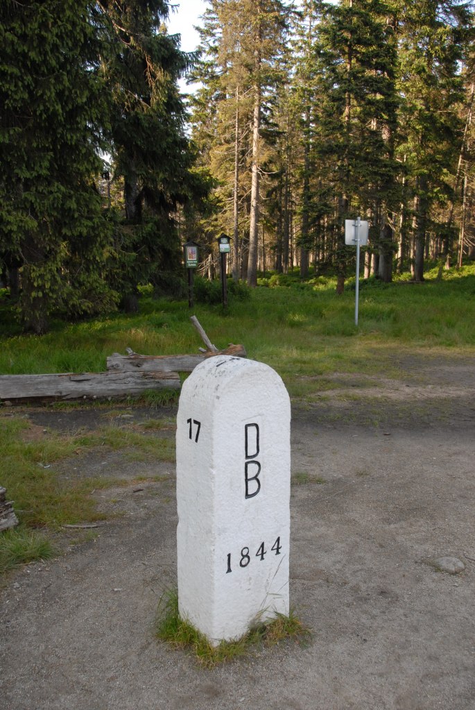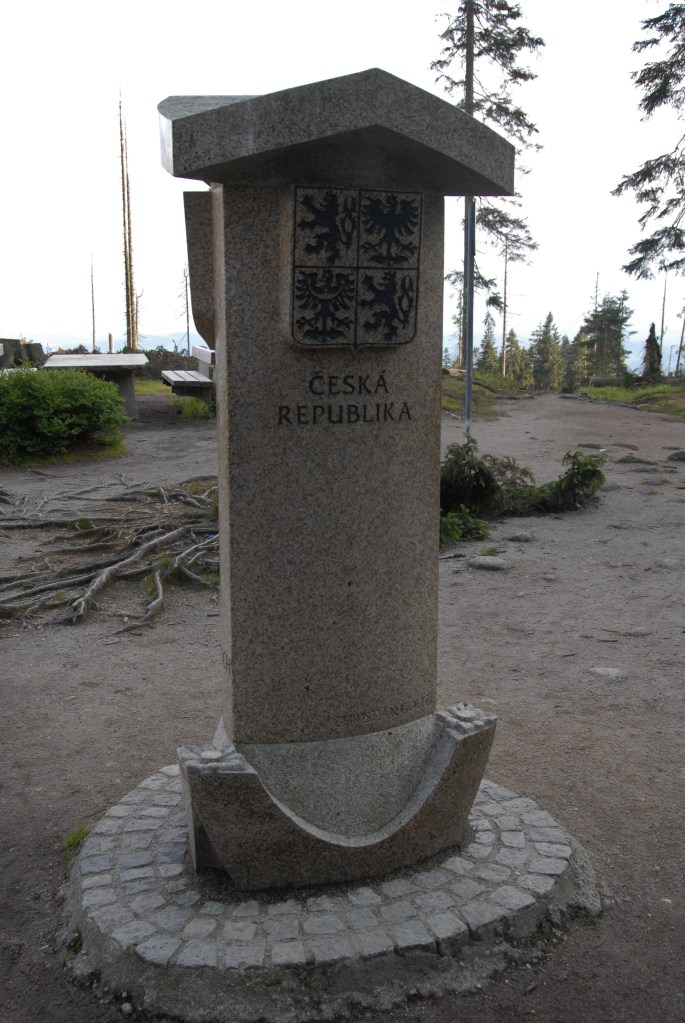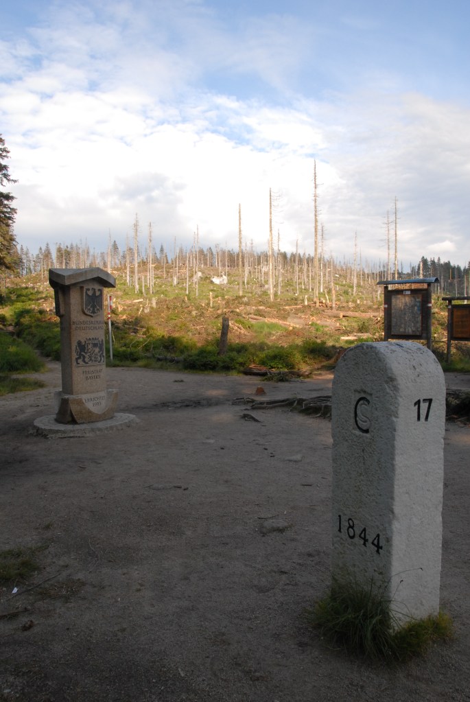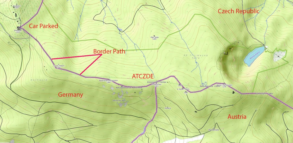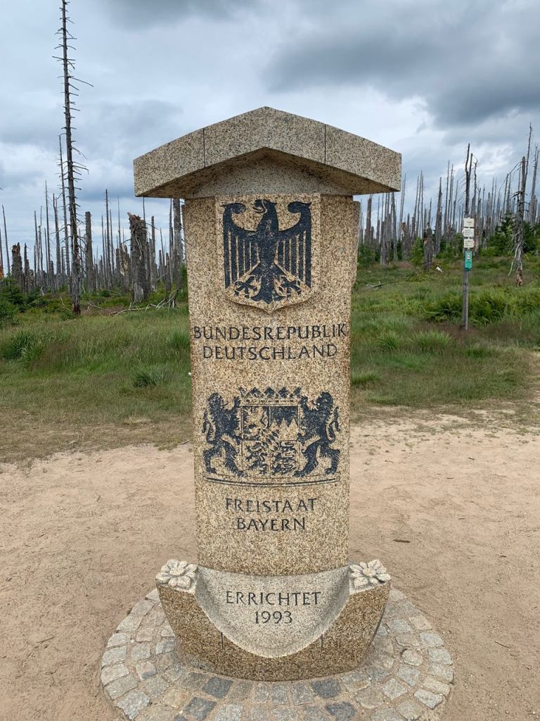The Austria – Czech Republic – Germany Tripoint is a dry tripoint located within the Šumava National Park and the Bayrischer Wald nature area. We accessed the tripoint from a car park near the Berggasthof Dreisessel and walked along the Czech – German Border path to the tripoint, taking in the Bayerischer Plöckenstein on the way. The tripoint is marked by a three sided monument with national symbols on each side. The forest showed signs of environmental damage through bark beetle infestation. Interesting border signs and border markers en route.