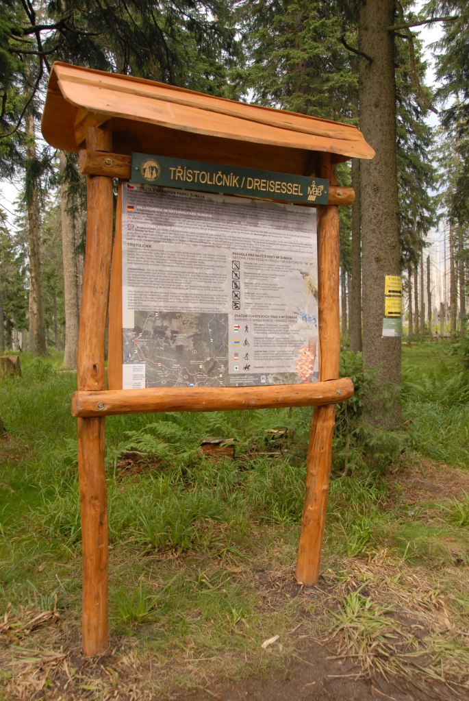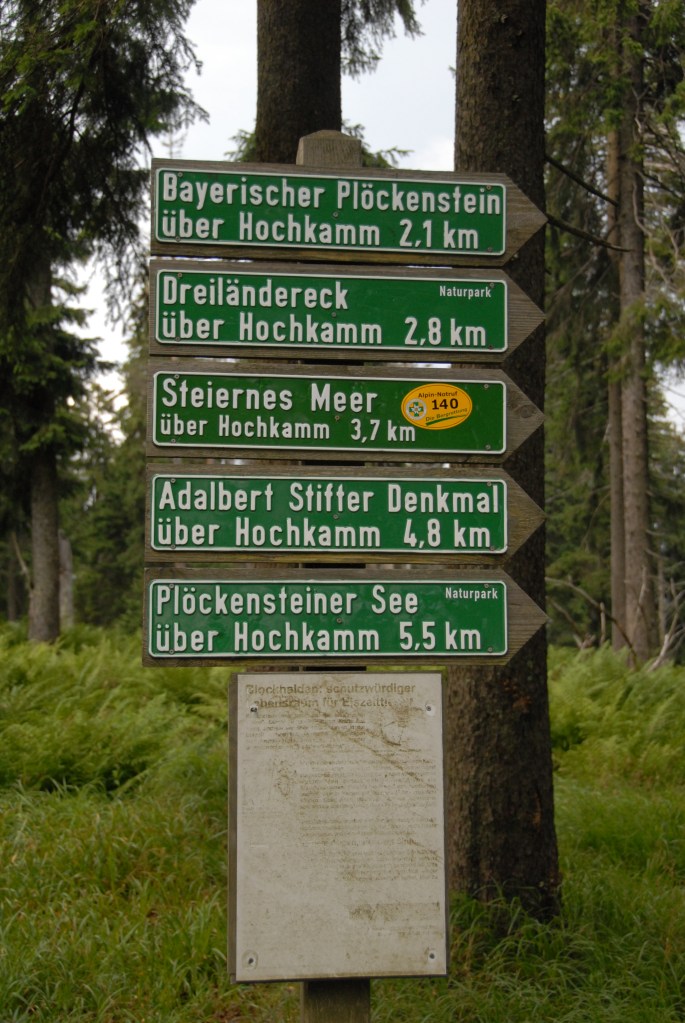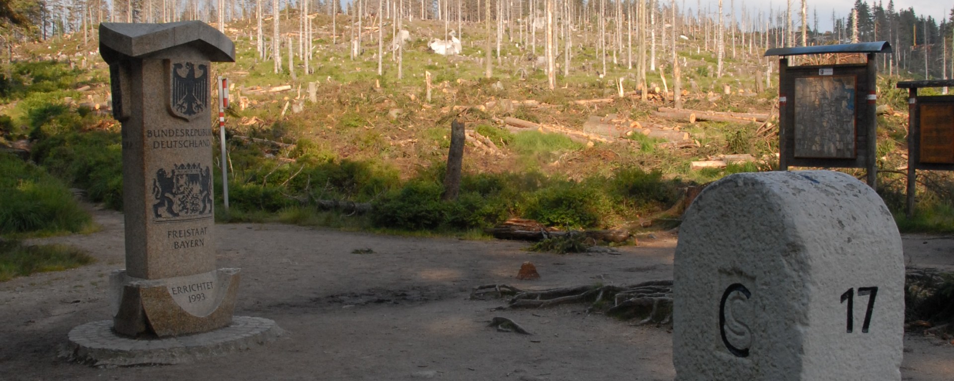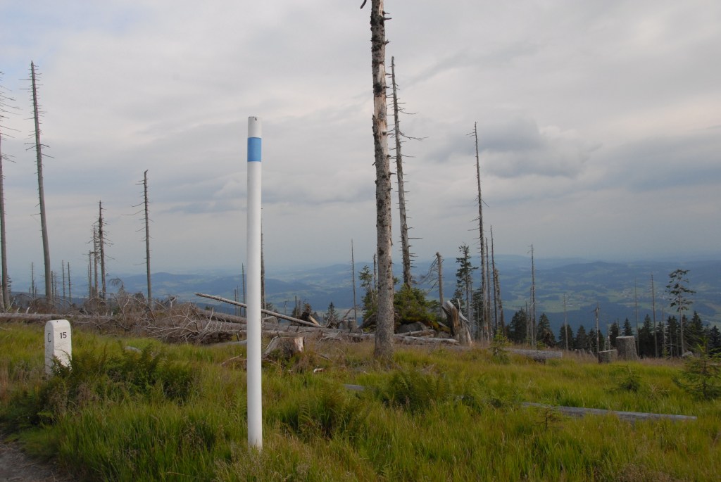 The Austria – Czech Republic – Germany Tripoint is a dry tripoint located within the Šumava National Park and the Bayrischer Wald nature area. We accessed the tripoint from a car park near the Berggasthof Dreisessel and walked along the Czech – German Border path to the tripoint, taking in the Bayerischer Plöckenstein on the way. The tripoint is marked by a three sided monument with national symbols on each side. The forest showed signs of environmental damage through bark beetle infestation. Interesting border signs and border markers en route.