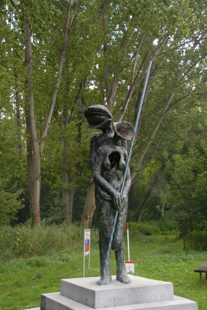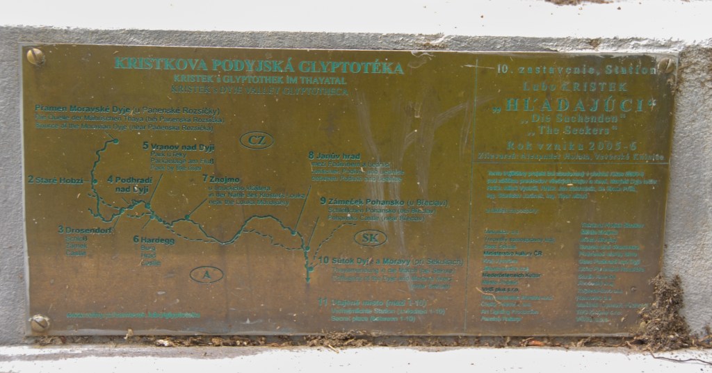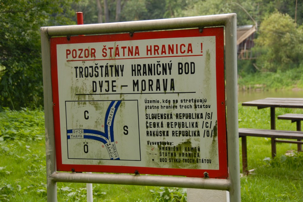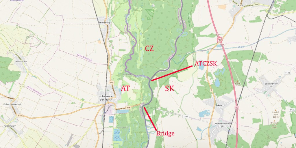 The Austria – Czech Republic – Slovak Republic is a wet tripoint at the confluence of the Thaya and March Rivers. It is accessible from either country. In this instance I accessed it from the Slovak side parking my car at the bridge and walking along the back. There were fishing huts on the Austrian and Slovak sides and signs and sculptures on the Slovak side. Could not see anything on the Czech side.