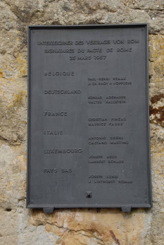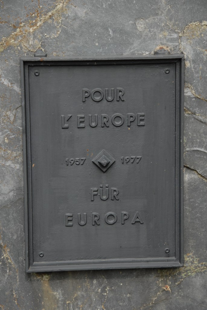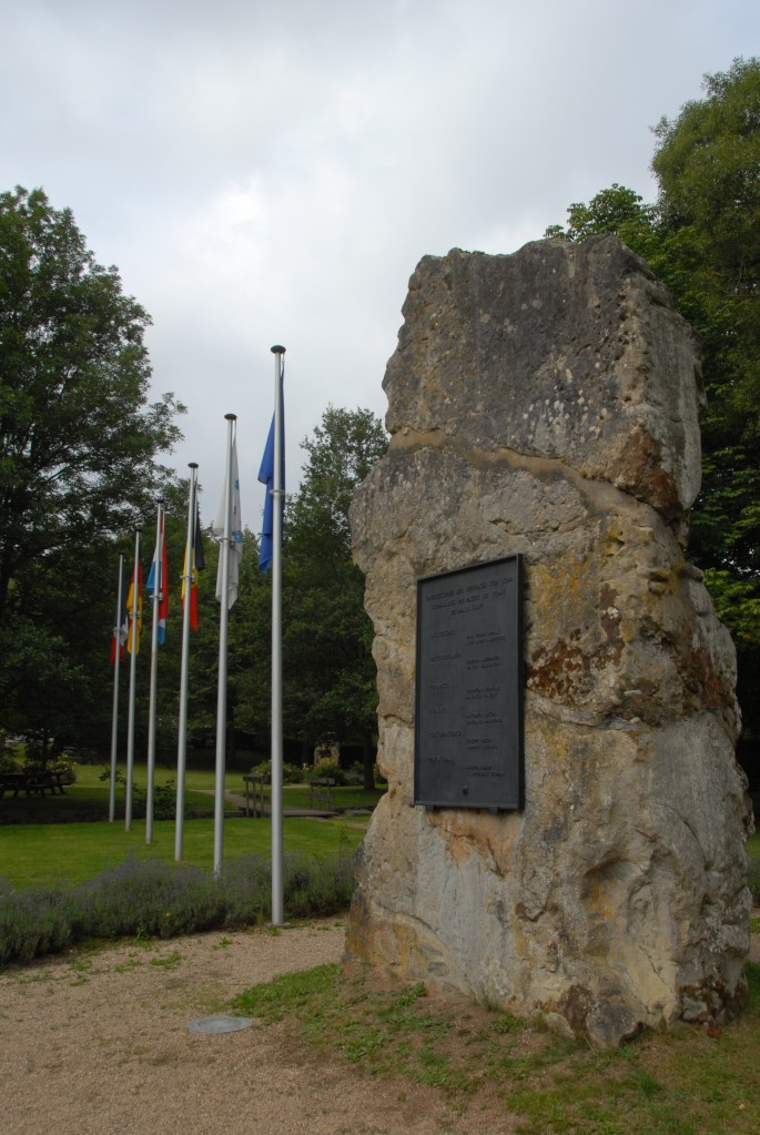 Straddling the border between the Belgium and Luxembourg there is a pleasant park. This Europa Monument was established in 1977 by Georg Wagner (the bridge is named after him). Twenty years after the Treaty of Rome was signed, Luxembourg politician Georg Wagner wanted to commemorate the birth of a united Europe. The President of the Luxembourg Parliament was a strong believer in the European ideal. Five boulders from the three participating countries bear the names of deserving Europeans including Konrad Adenauer. The memorial stones come from the respective countries of origin of the named founding fathers. Gneiss boulder from the Lüneburg Heath for Adenauer, a sandstone block from the Müllerthal-Waldbillig for Bech, blue slate stone from the Hohen Venn for Spaak and a slate block from the Vosges for Schuman. The fifth stone represents the Treaties of Rome and the signatories from the six participating countries.