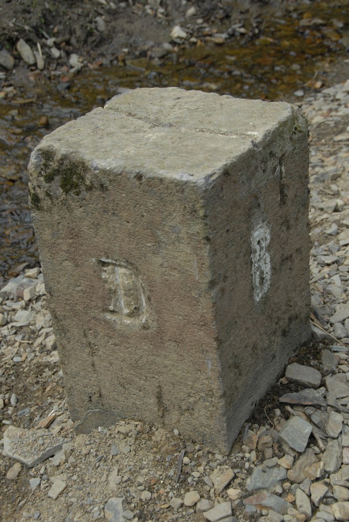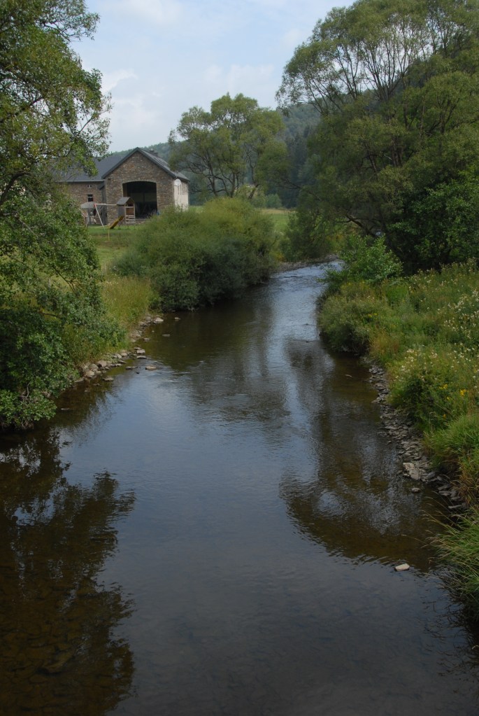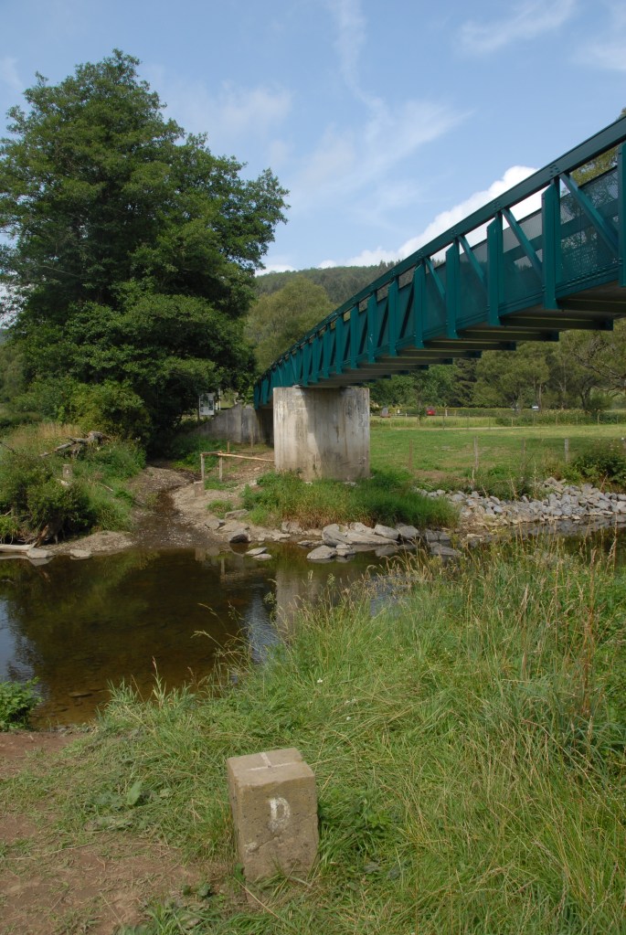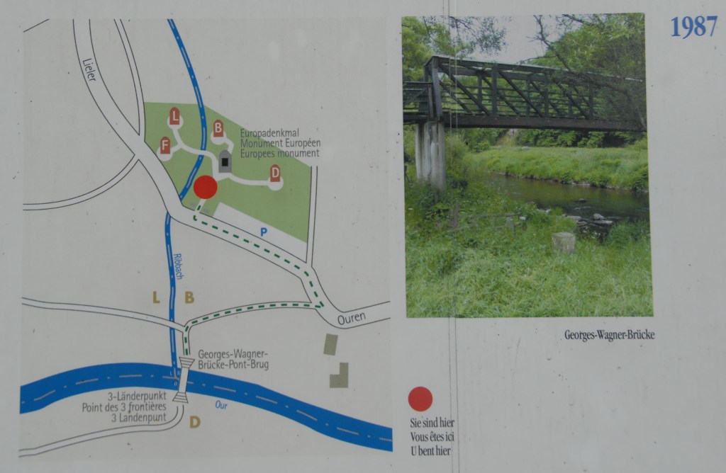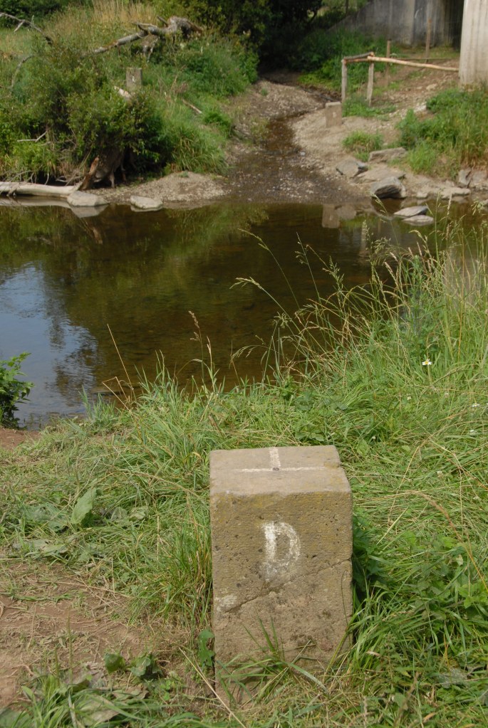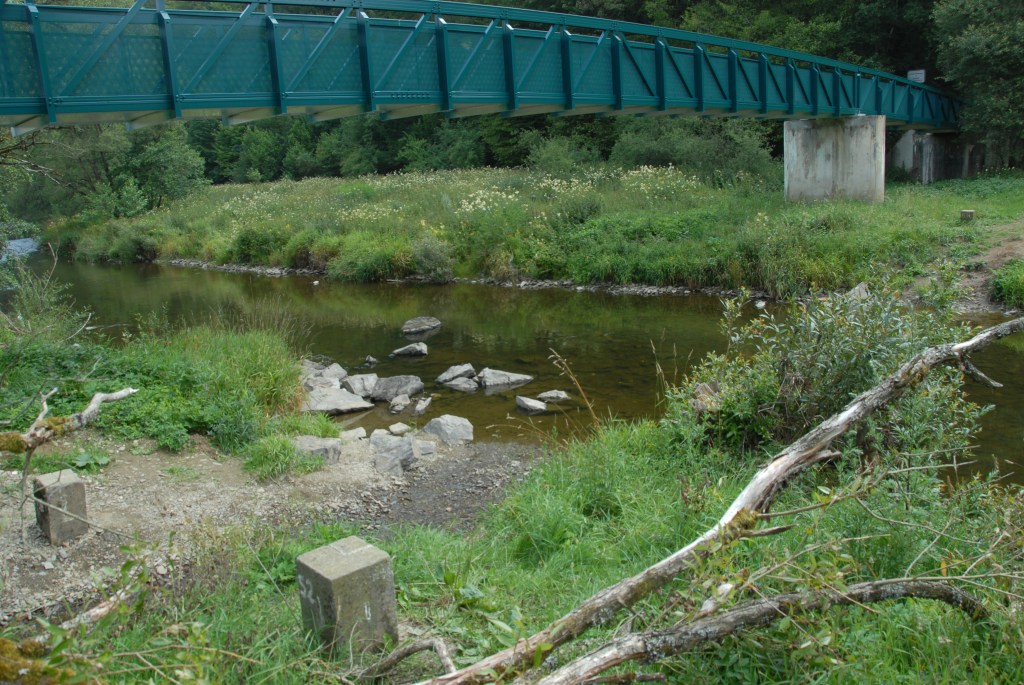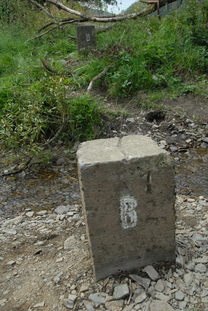 The photo on the left shows the view from the German bank and the border marker indicates the border configuration on its top. Note the 2 border markers on the opposite bank at the confluence between the Ribbach and the Our – the left hand side being Luxembourg, and slightly further away from the border than the Belgian one on the right hand side.