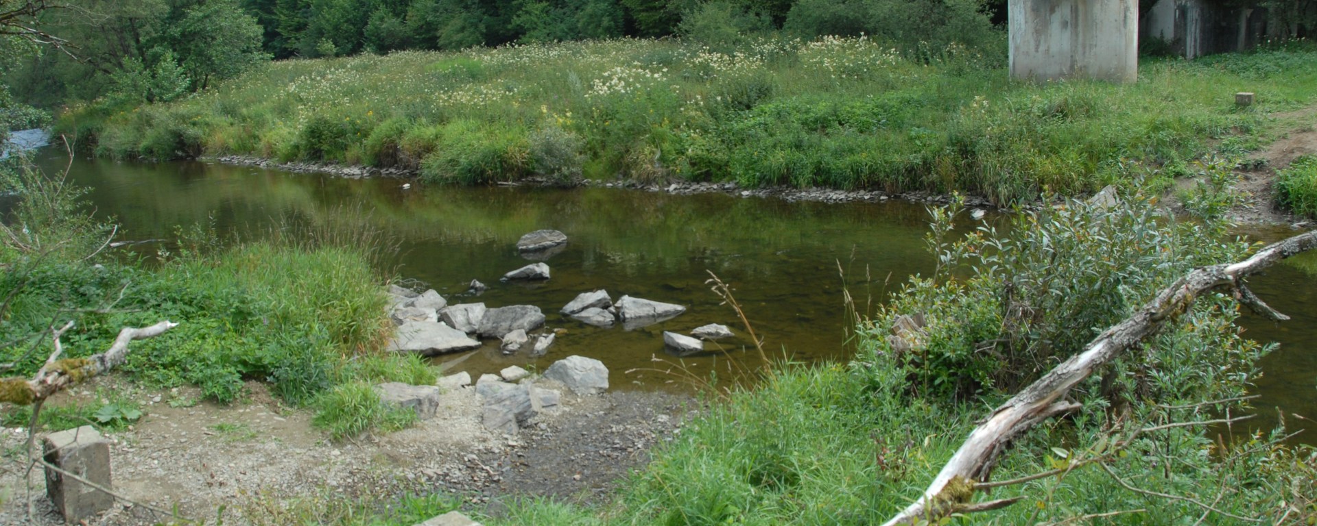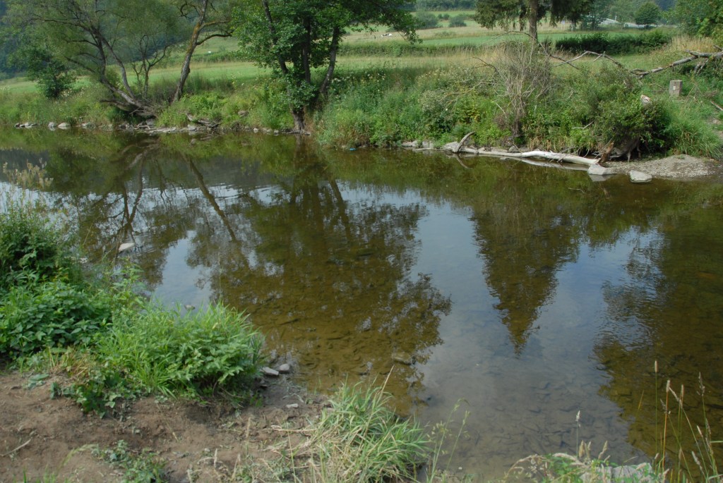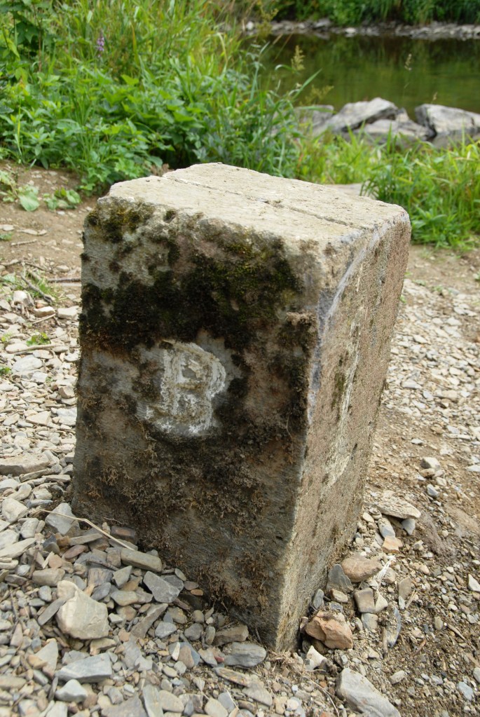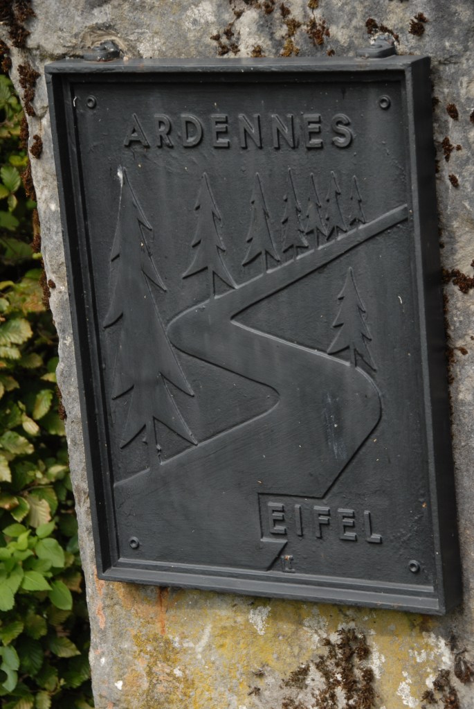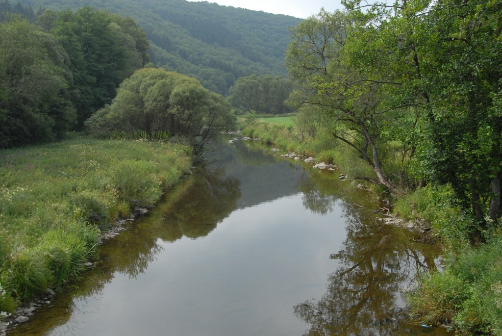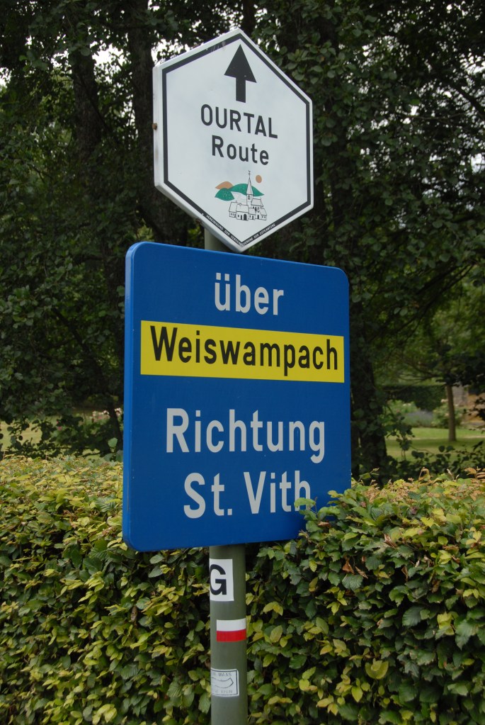 The photo on the left shows the view from the German bank and the border marker indicates the border configuration on its top. Note the 2 border markers on the opposite bank at the confluence between the Ribbach and the Our – the left hand side being Luxembourg, and slightly further away from the border than the Belgian one on the right hand side.