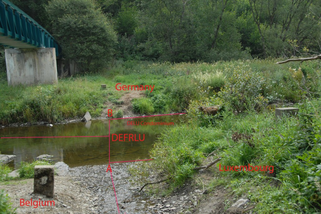 As indicated in the German map above BEDELU is in the center of the river, with 2 technical tripoints on either side. A indicates BEDELULU on the western bank of the Our, whilst B indicates BEDEDELU on the eastern bank. South of the triline the condominium jointly exists between Germany and Luxembourg. North of the triline the Belgium – Germany border follows the Thalweg. The confluence is between the Ribbach and the Our.
