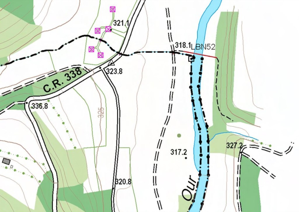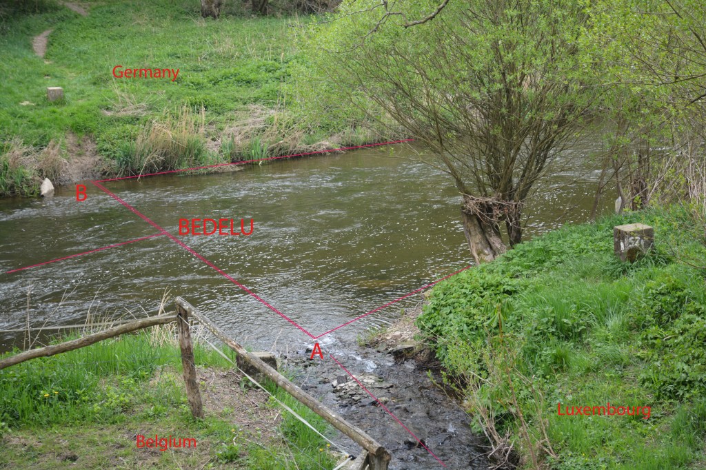 As indicated in the German map above BEDELU is in the center of the river, with 2 technical tripoints on either side. A indicates BEDELULU on the western bank of the Our, whilst B indicates BEDEDELU on the eastern bank. South of the triline the condominium jointly exists between Germany and Luxembourg. North of the triline the Belgium – Germany border follows the Thalweg. The confluence is between the Ribbach and the Our.