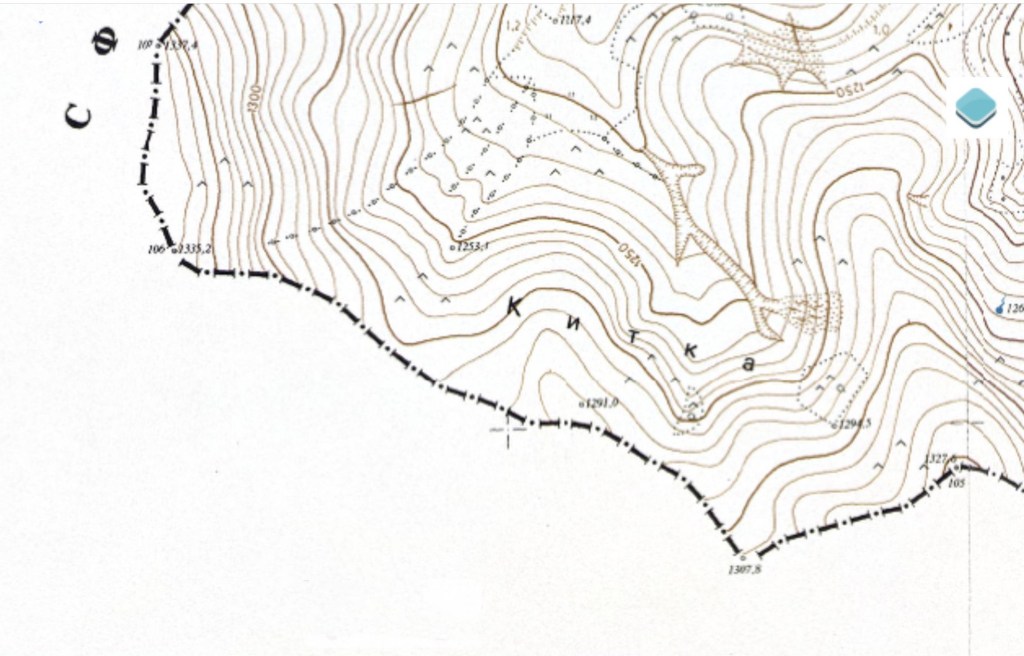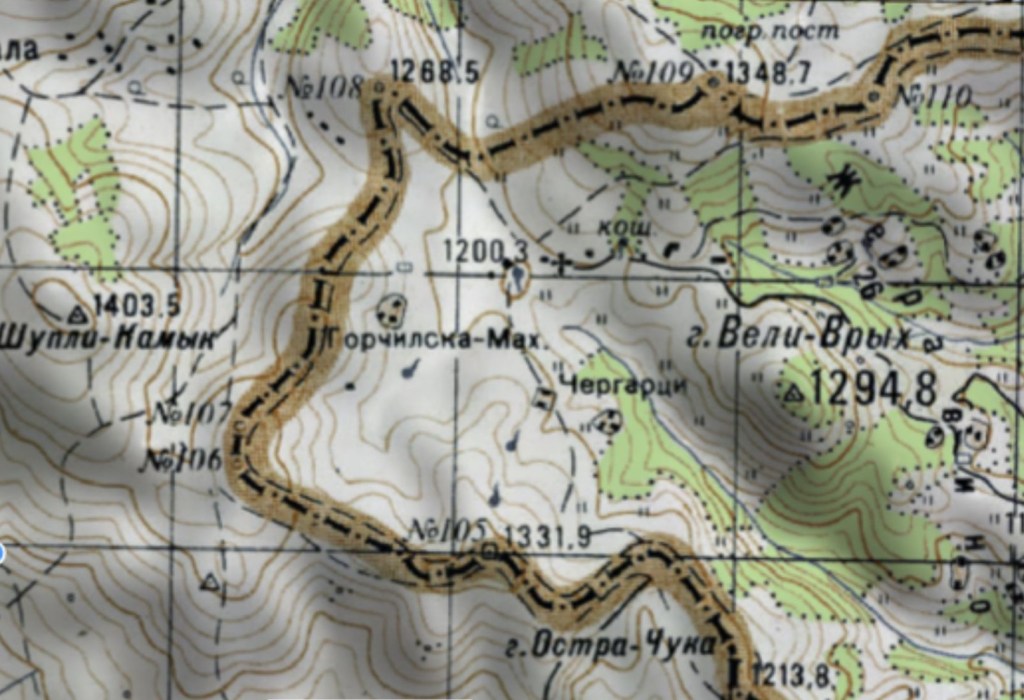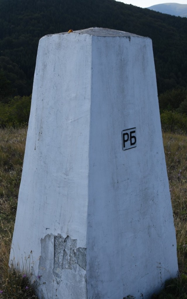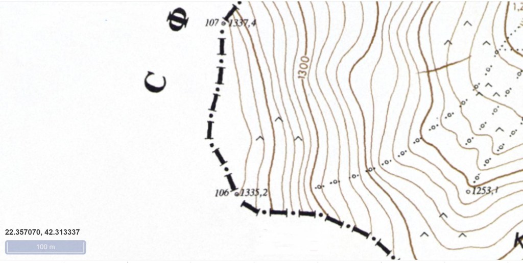 The tripoint is on the top of Shulep Kamak Peak, marked on the Bulgarian map below as border marker #106. in between that point and #107 there were intermediate markers. On the ground however, the border markers had different numbering to that on the map, the BG/MK marker BM #105 was the same, but the BG/RS markers were different.