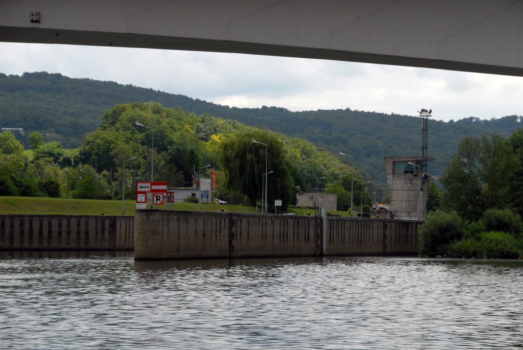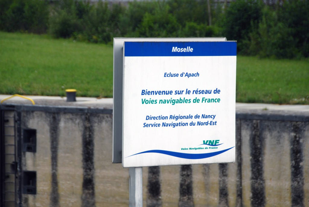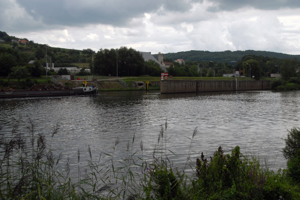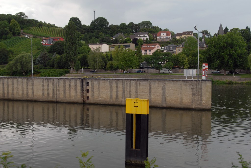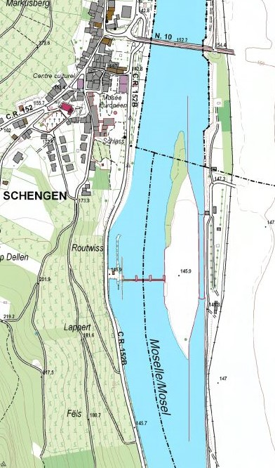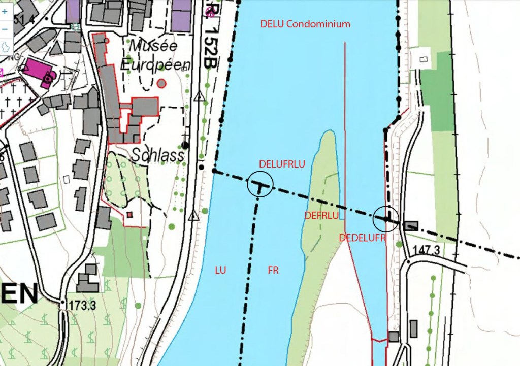 DELUFRLU is the western technical tripoint and is where the condominium meets the border between Luxembourg and France in middle of the Moselle. DEDELUFR is the eastern technical tripoint where the borders of France and Germany meet on the side of the lock. In between these 2 points is the triline (not one single point) DEFRLU. This triline is approximately 114 m long and cuts across the island in the Moselle.